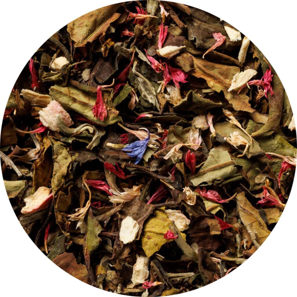 • Skład: Biała herbata Pai Mu Tan, rabarbar, gruszka, chaber biały i różowy,