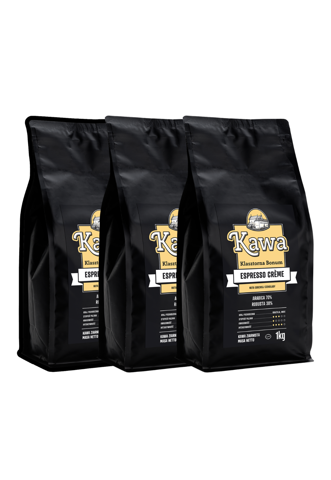 Zestaw 3 opakowań kawy Espresso Crème 1kg. Świeżo palona, wysyłka 24h (w dni robocze).